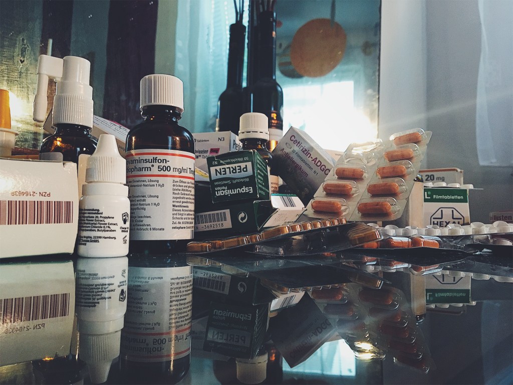 Siehe da, Tabletten, Salben, Tropfen, Sprays und ähh.. Hustenbonbons. Fehlen eigentlich noch Spritze, Löffel und Feuerzeug.