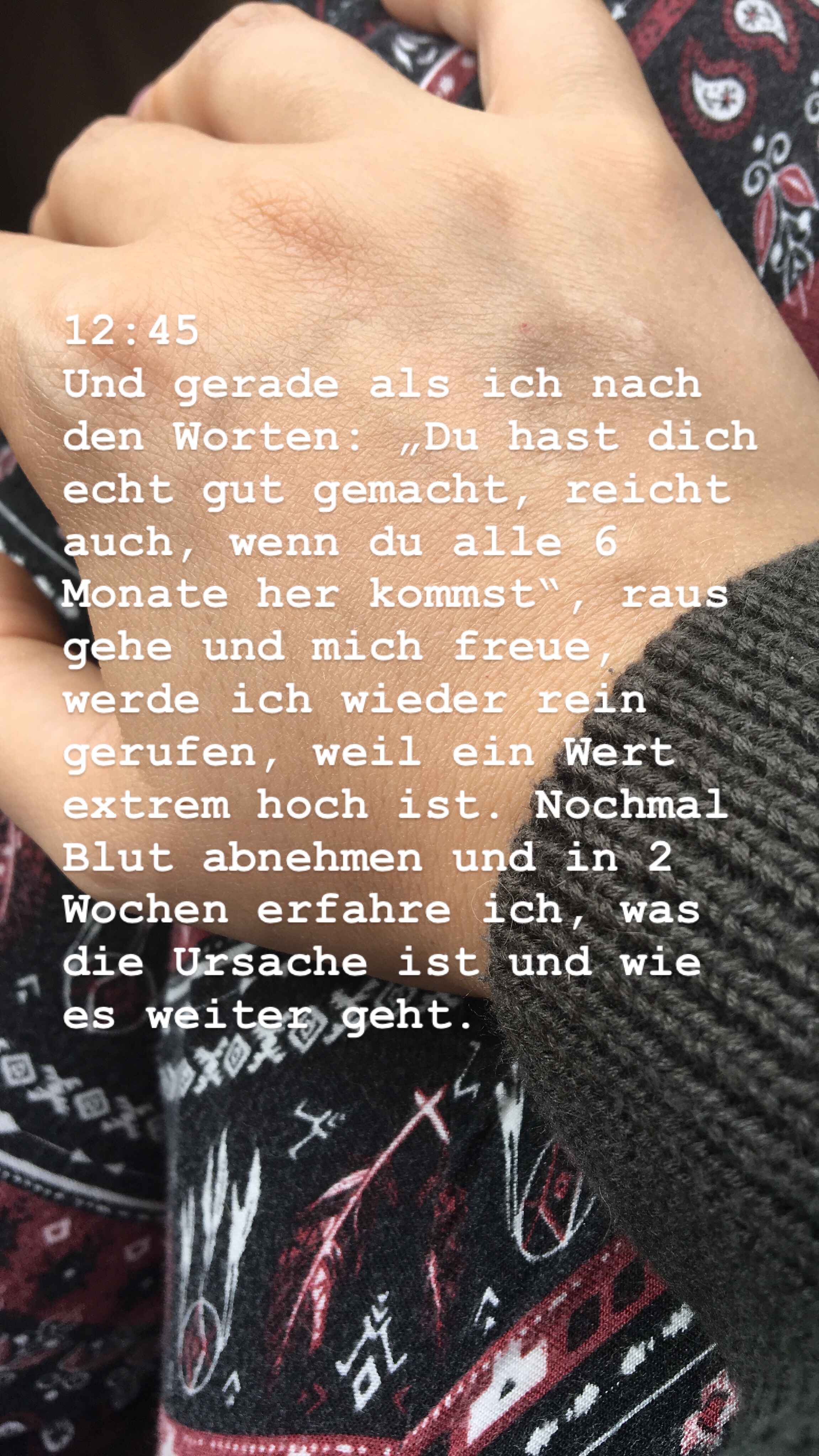 Doch in diesem Moment kommen meine Werte und einer davon ist bedrohlich hoch. Könnte ein Zeichen für einen Virus sein oder daran liegen, dass ich im Januar meine Hepatitis-Impfungen habe auffrischen lassen. In 14 Tagen gibt es Post nach Hause, dann weiß ich mehr. Das ist mal wieder einer der Momente, die pure Panik in mir auslöst, auch wenn der Prof sagt, es sei nichts akutes und ich muss mich nicht fertig machen.